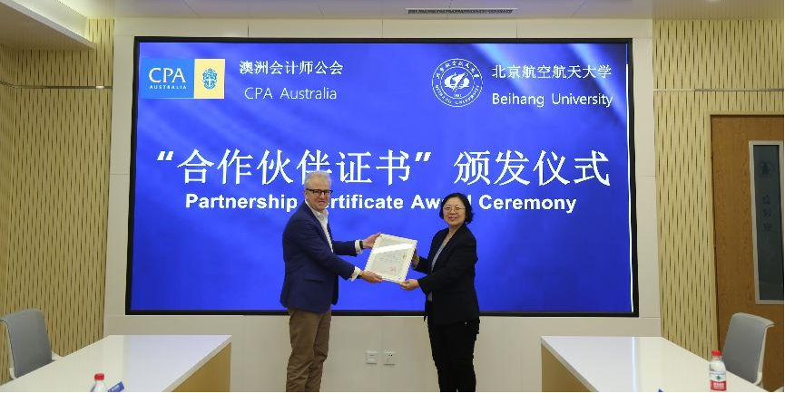 最后,范英院长为Chris Freeland先生颁发了“合作伙伴证书”。双方签署了合作备忘录。备忘录强调,此次签约旨在正式确立并巩固双方的关系,促进双方更多的合作与协同。通过共同努力,可以充分发挥各自的优势、利用各自的资源,实现共同目标,为澳公会会员和北航学生创造更大的价值。