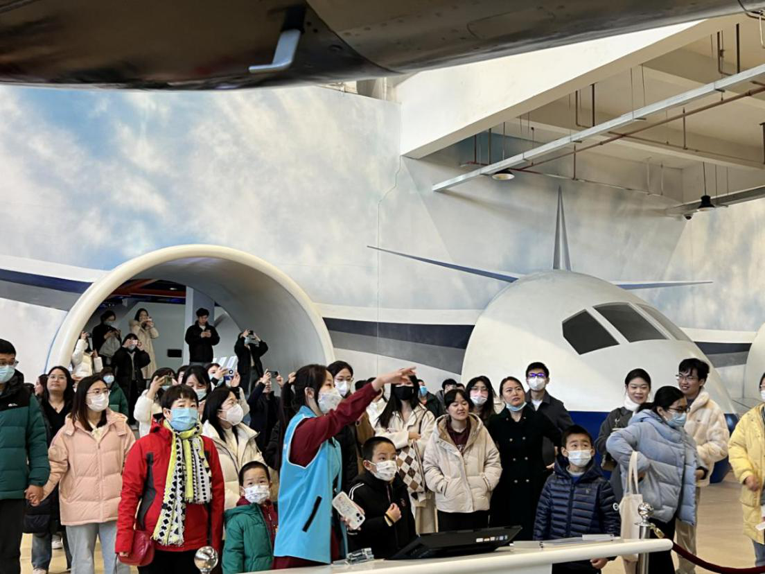 最后,讲解老师介绍了空天走廊展区。展区分为航空发展史和航天发展史两个部分。按照历史发展的时间顺序,展示了我国航空航天发展的壮阔历史画卷。