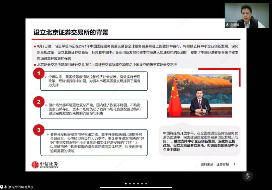 10月16日晚8点,2021级MPAcc学生迎来了第二期会计前沿讲堂——《北京证券交易所政策解读》。本期讲堂邀请到了中信证券财富管理委员会运营管理部凌福博老师,主要负责制定经济业务体系内相关业务制度及操作流程,涉及股票、债券、基金、产品等品种。本期讲堂由MPAcc教育中心主任白明老师主持。