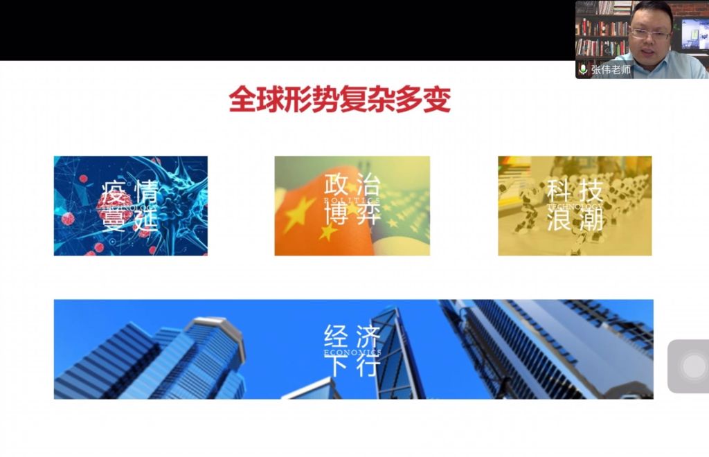 张老师首先指出,当前全球形势复杂多变,主要表现在四个方面:其一,疫情蔓延是短期难以散去的阴影,新冠肺炎疫情是自1918年西班牙大流感以来传播速度最快、感染范围最广、防控难度最大的重大突发公共卫生事件。中国对于疫情的快速严密防控,长远来看,有利于快速复工复产和经济的恢复;其二,大国博弈使得全球治理体系正在深刻变革;其三,科技浪潮下信息技术革命将重塑经济;其四,经济长期增长动能减弱。