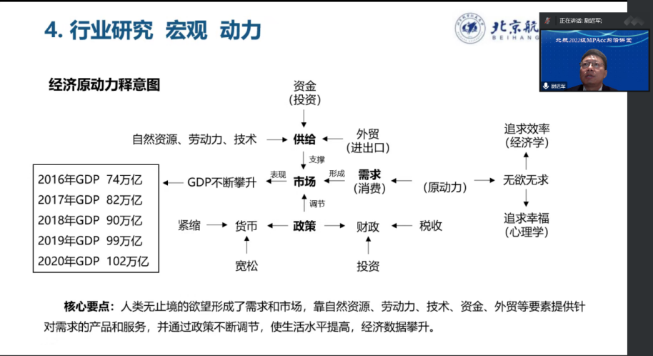 在讲述企业战略和行业研究内容时,老师重点讲解了经济原动力的五要素——“供给”、“市场”、“需求”、“政策”和“人的欲望”,并阐明了这些要素之间的关系,由此引入对产业投资完整流程的介绍。