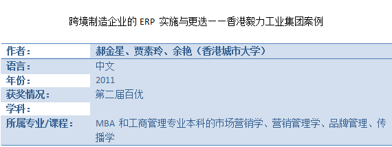 百优案例——《跨境制造企业的ERP 实施与更迭——香港毅力工业集团案例》