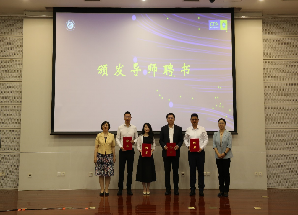 范英院长与牟晖副院长共同为2024年四位新聘校外导师颁发了聘书,他们是用友网络科技股份有限公司副总裁董波、中海油华北销售有限公司财务总监李风平、常见投资管理(北京)有限公司副总经廉涛以及北京财帮科技管理有限公司创始人兼CEO王峰。
