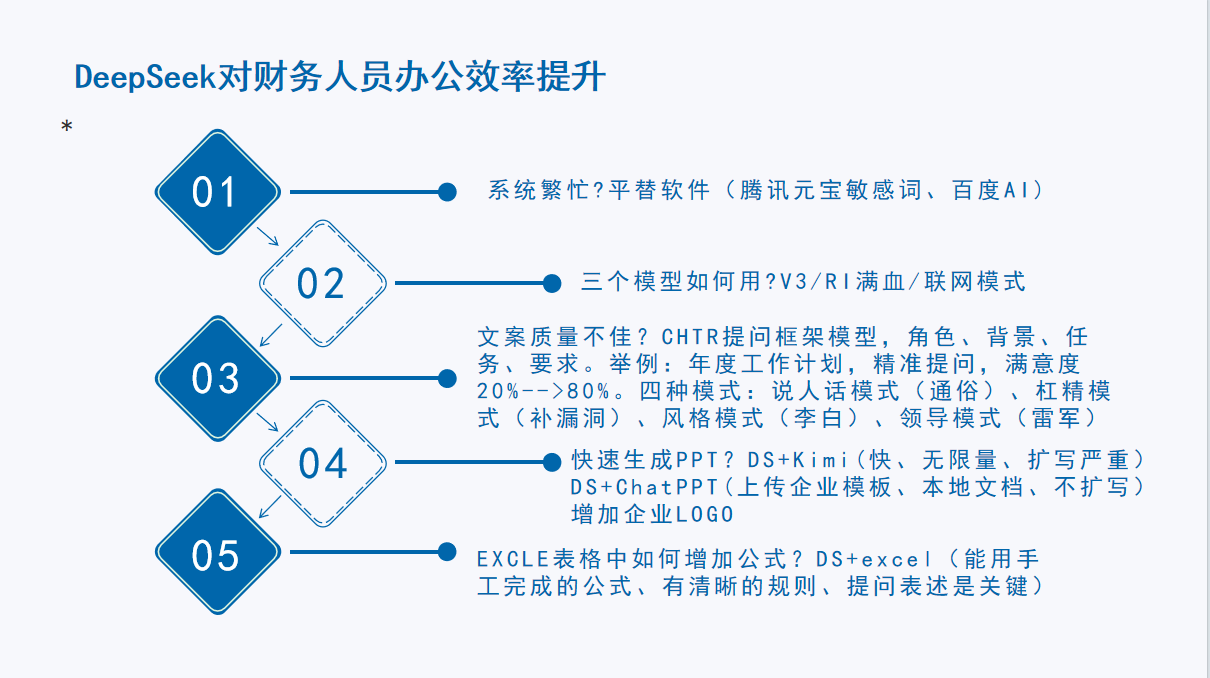 最后,薛老师解读了DeepSeek在工作中的应用,针对不同的工作场景,建立提问框架模型来获取可利用的信息,提升财务人员的办公效率。